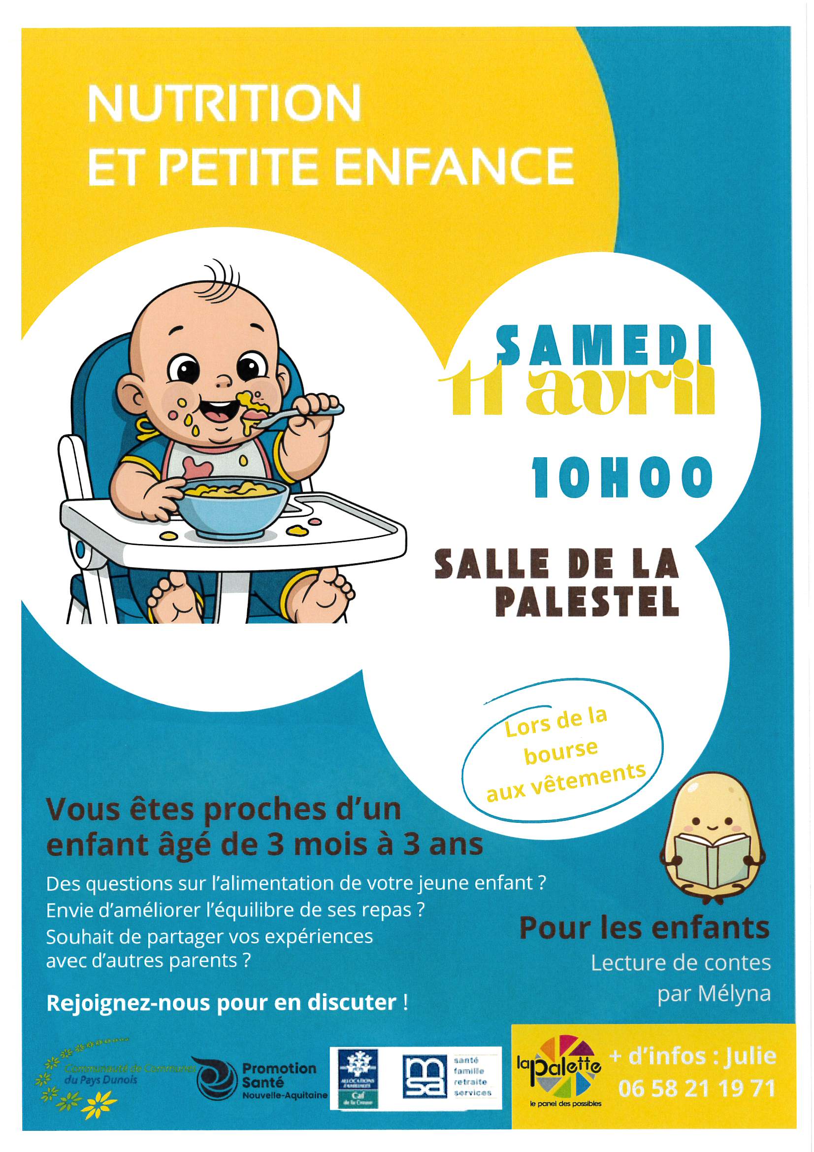 Samedi 11 avril 2026 à 10h une animation autour de l’alimentation des enfants de 3 mois à 3 ans est proposée. Vous pouvez venir avec vos enfants. Mélyna de l’Accueil de loisirs leur proposera la lecture de contes durant ce temps de partage.