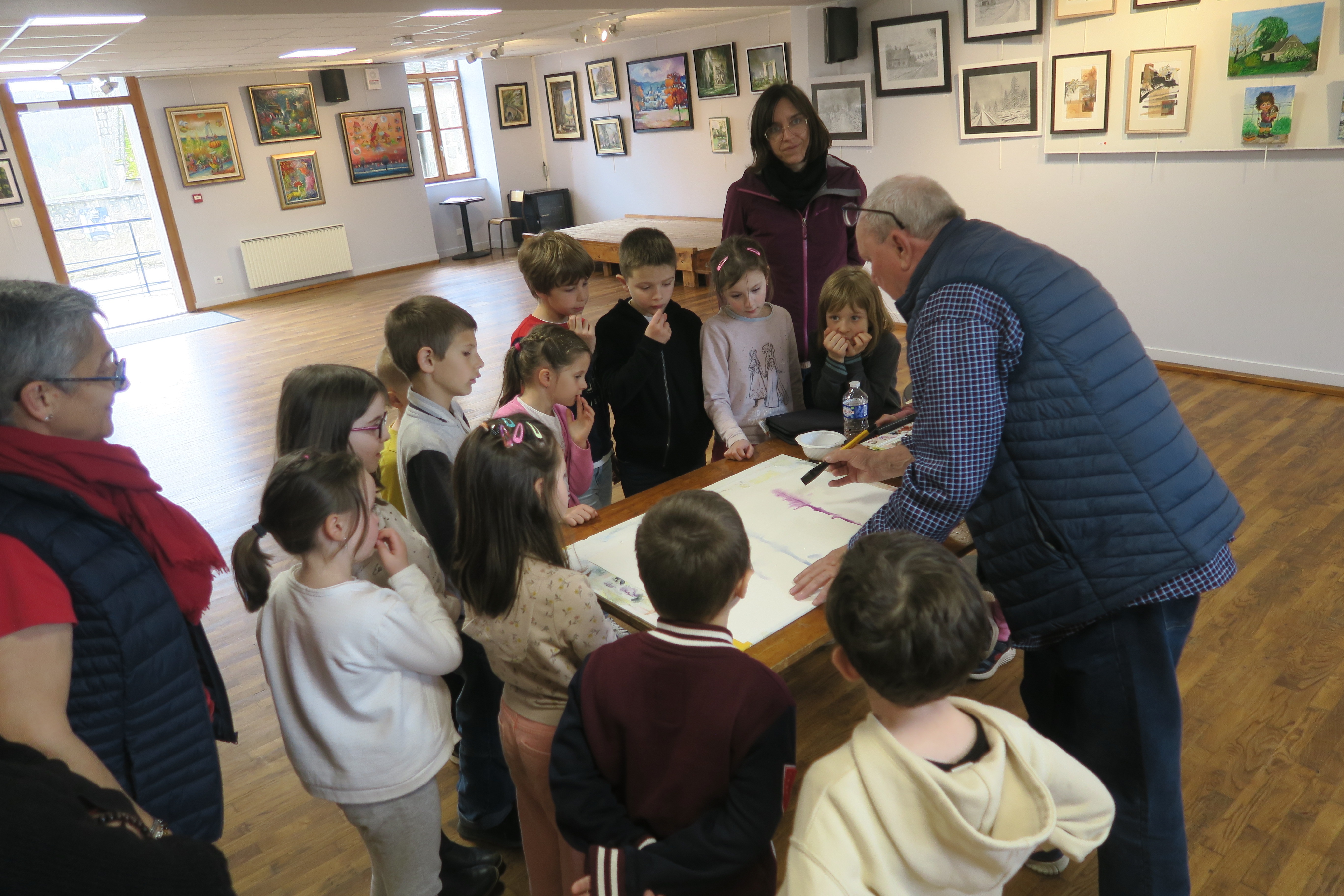 Au début de l’expo, l’artiste Eric Baudet a animé un moment de visite guidée et d’initiation à l’aquarelle avec quelques enfants de la section CP-CE1 de l’école