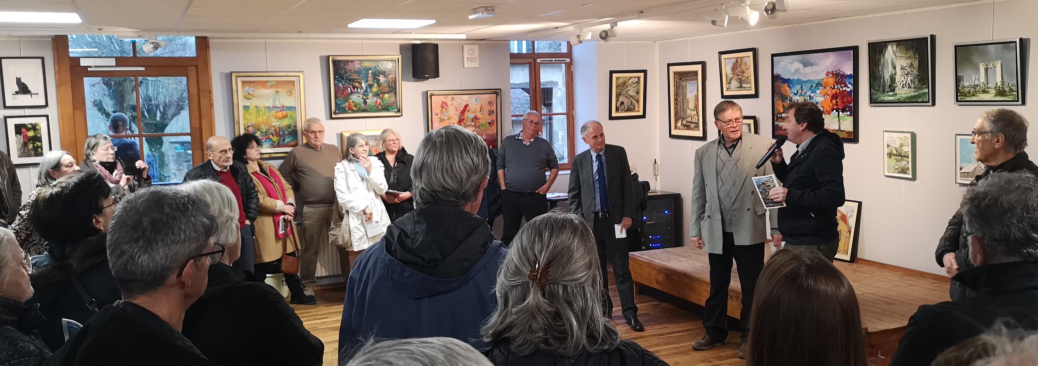 Vernissage du 29 mars 2024, au cours duquel le maire Bruno Dardaillon, le président de la communauté de communes du Pays Dunois Laurent Daulny et le sénateur Jean-Jacques Lozack ont pris la parole. En présence notamment de Michel Vergnier, ancien élu député-maire de toujours fidèle à l’expo, du Maire honoraire Gérard Delafont et d’élus des alentours, ainsi que des artistes et amateurs-clients.